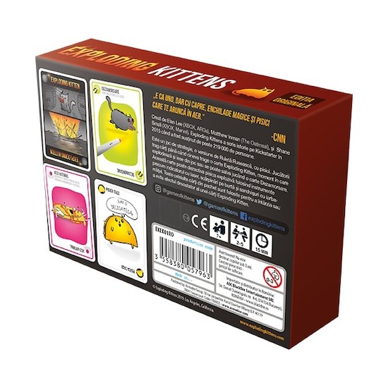 Jocul se poate invata in 5 minute, iar o partida de joc poate dura intre 15-20 minute. Exploding kittens se poate juca cu 2 sau maxim 5 jucatori. In pachet veti primi cele 56 de carti impreuna cu instructiunile.