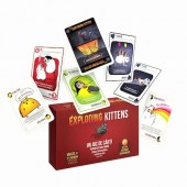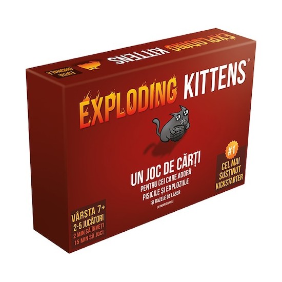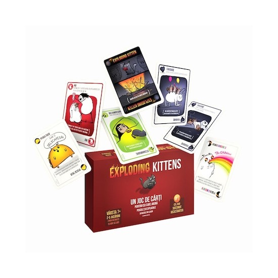 Exploding Kittens este un joc plin de putere pisiceasca, o varianta a ruletei rusesti. Jucatorii trag carti pe rand pana cand unul dintre ei trage o pisica exploziva si pierde jocul. In joc vei gasi carti care te lasa sa te uiti la alte carti sau cu care poti obliga un oponent sa traga mai multe carti.