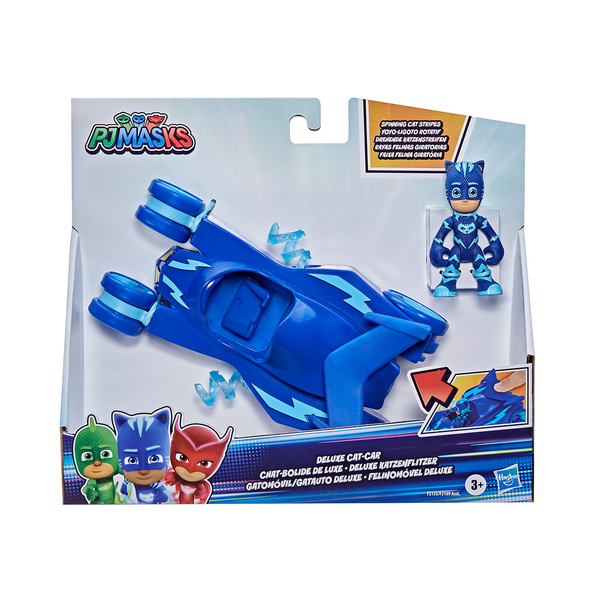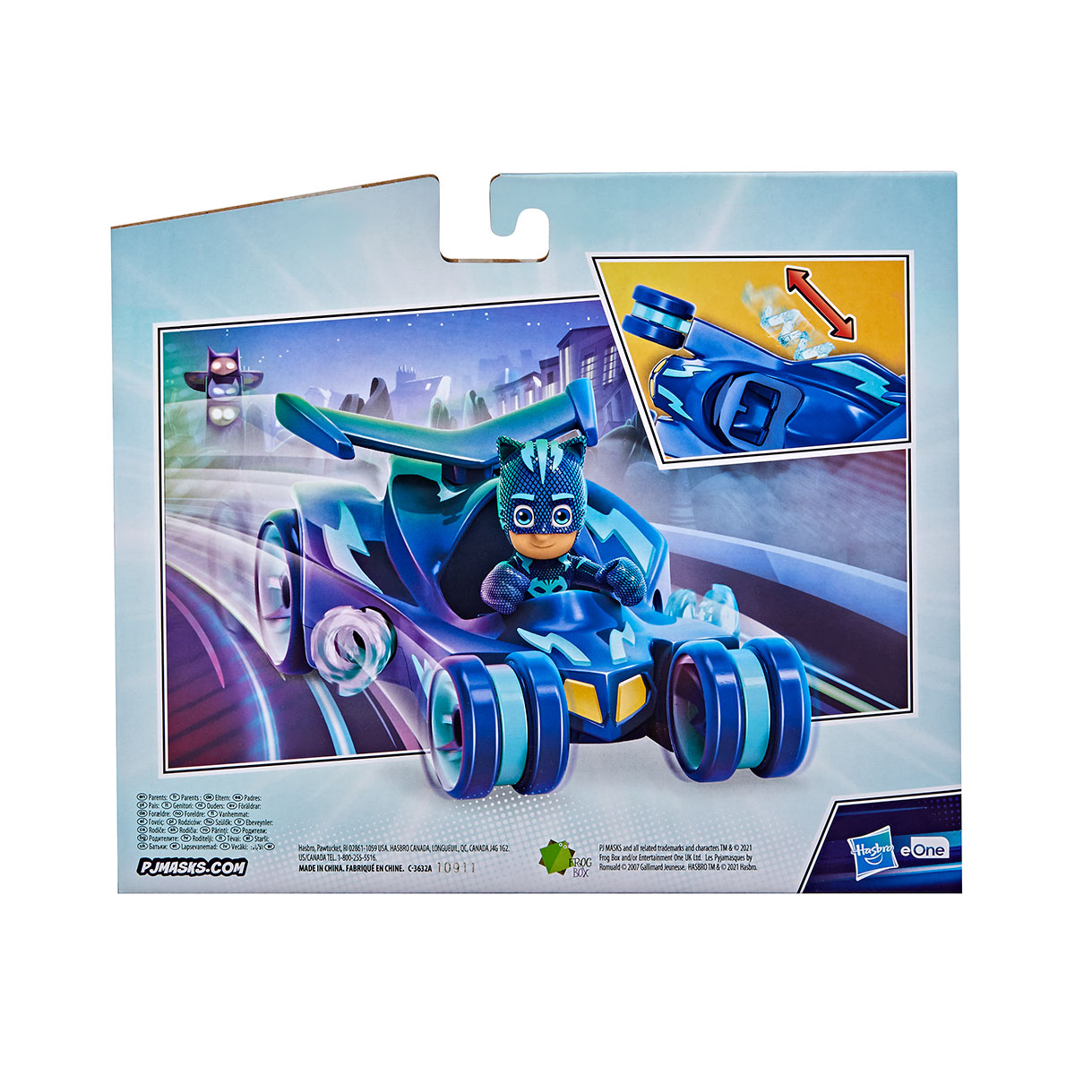 Masina are caracteristici mecanice, este compatibila cu toate figurinele PJ Masks de la Hasbro si nu necesita baterii sau alte surse de alimentare. Dispune de functii complet mecanice ceea ce o face de doua ori mai interesanta!