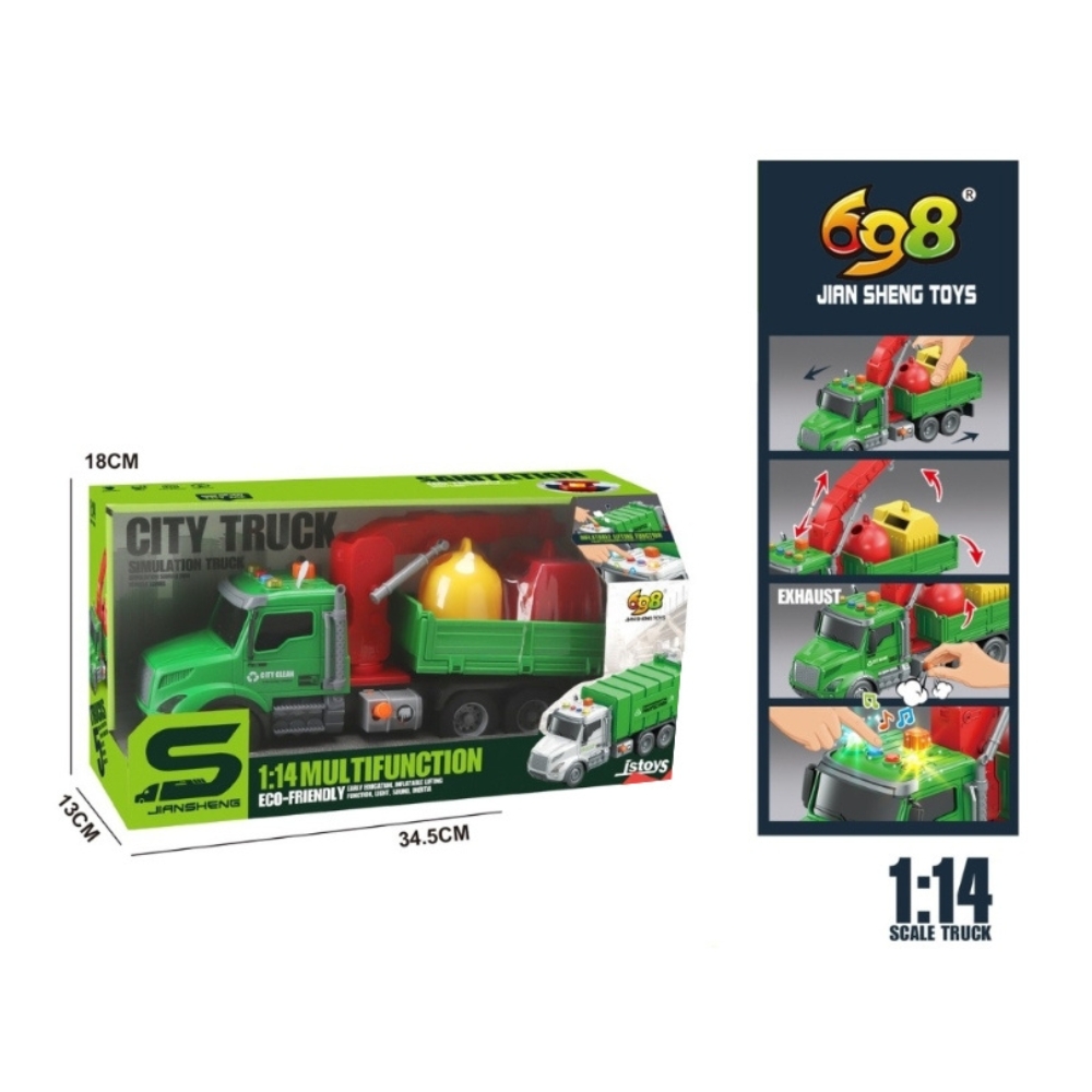 Camion cu remorca, macara si tomberoane, frictiune, buton presiune, sunete si lumini, 1:14, jstoys, ZJA363787
