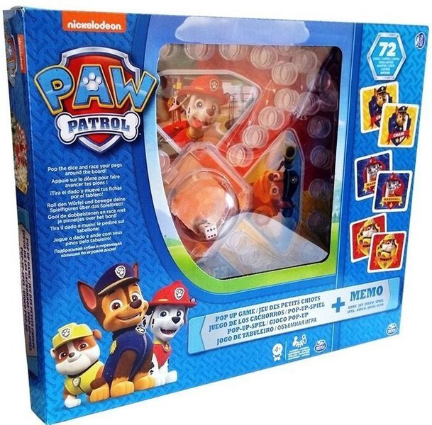 E timpul sa te joci cu personajele din seria Paw Patrol! Un set de doua jocuri - Memo si Pop Up!. Exersati-va memoria si incercati sa potriviti cartile jucand card Memo. Intoarceti cartile si acoperiti notand in ce loc se afla eroul. Al doilea joc pop-up te va distra cu cainii tai preferati. Alegeti culoarea pionilor si asezati-i in baza. Apasati butonul popper pentru a arunca zarurile. Cine isi duce primul pionii prin tabla inapoi la baza - castiga!