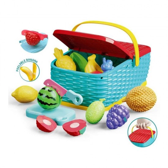 Un cos adorabil si interactiv, plin cu 14 fructe colorate si detaliate, precum mere, banane, portocale si struguri, fiecare fiind realizat din materiale sigure si durabile. Fiecare detaliu este atent realizat pentru a adauga realism jocului si pentru a incuraja copiii sa invete despre alimentatie, interactiuni sociale si sa simuleze experiente cotidiene. Cosul este usor de transportat si poate fi folosit atat in interior, cat si in aer liber.