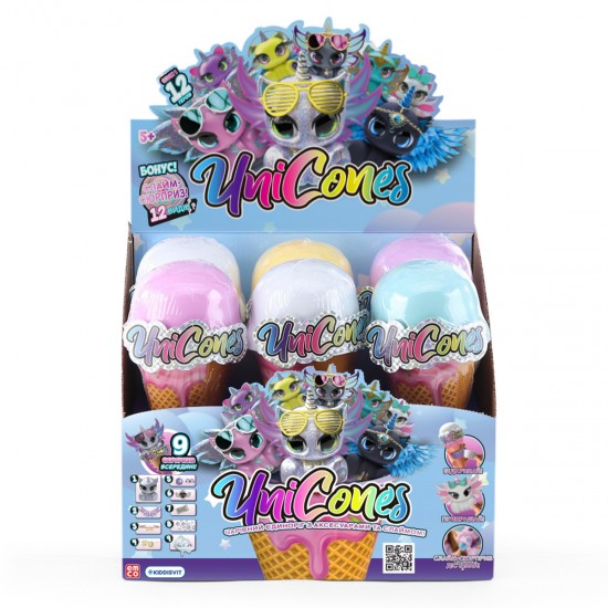 Setul de joaca cu figurine UNICONES este o colectie de unicorni draguti intr-un cornet de inghetata. In fiecare corn vei gasi o figurina fermecatoare a unui unicorn si inca cateva surprize in interior - slime, decor variat si accesorii cu care iti poti decora animalul de companie. Exista 12 personaje in colectie.