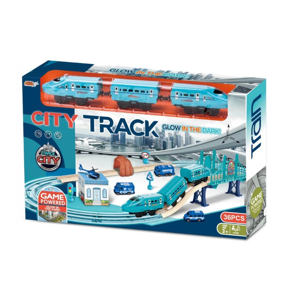 Set de joaca Cale ferata albastra cu tren electric, elemente fosforescente, accesorii si acumulator, ZJA361468