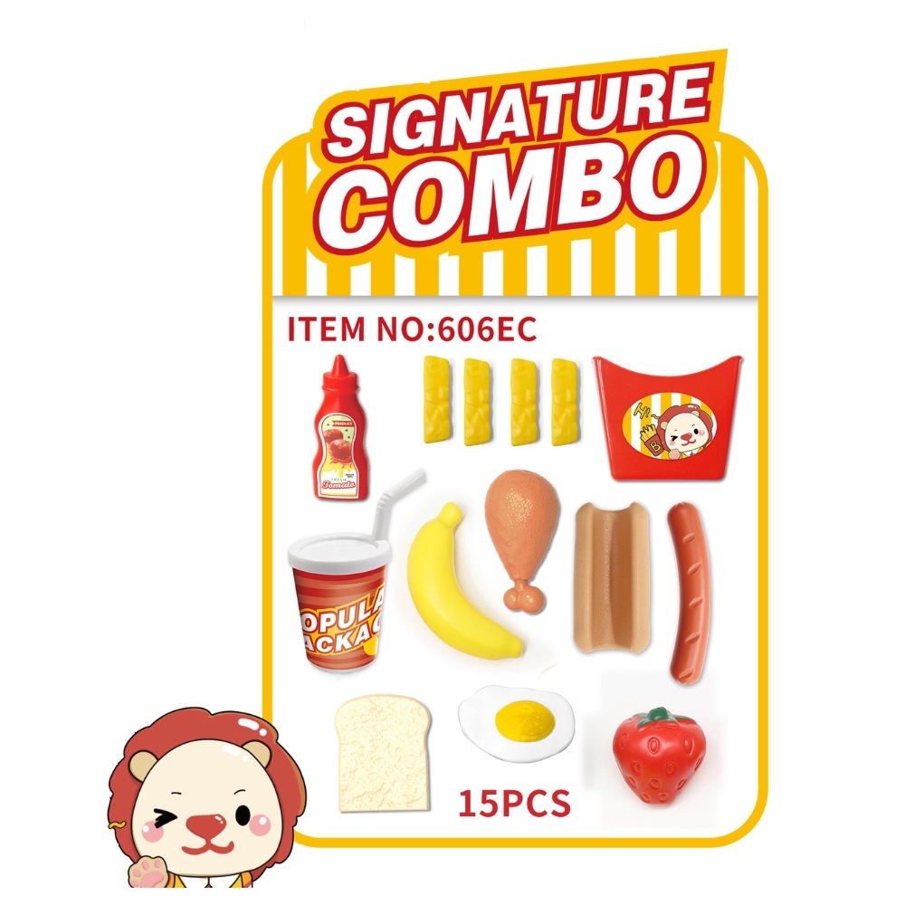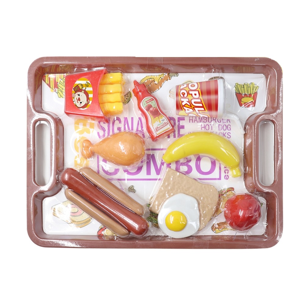 Un set adorabil si interactiv ce include un platou cu 15 piese de jucarie, care imita diverse preparate de fast food, cum ar fi hamburgeri, cartofi prajiti, bauturi si multe altele.
