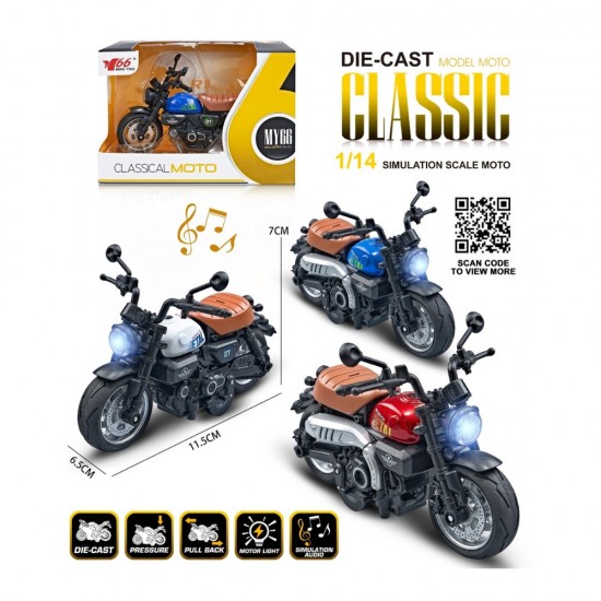 Jucarie Motocicleta clasica alb/rosu/albastru, 1:14, din metal, cu sunete si lumini, mecanism pull-back, ZJA354879