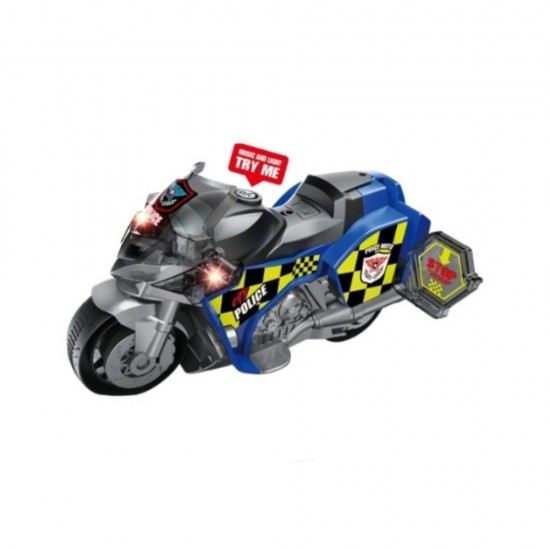 Jucaria include efecte sonore si luminoase, care fac jocul mai interesant. Are un design modern si atractiv, cu o culoare albastra si alba, tipica motocicletelor de politie.