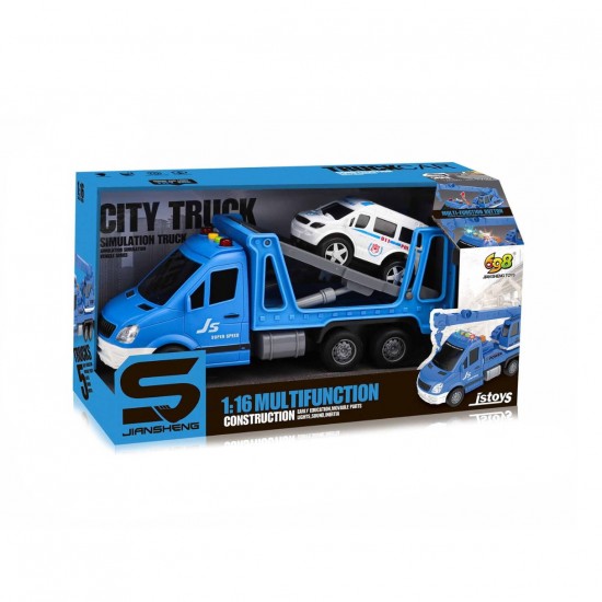 Evacuator albastru, cu masina alba, cu frictiune, sunete si lumini 1:16, jstoys