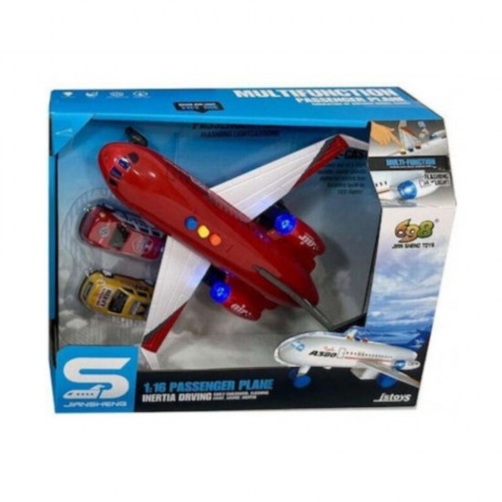 Avion cu frictiune rosu si 2 masinute, sunete si lumini, 1:16, jstoys, ZJA347494
