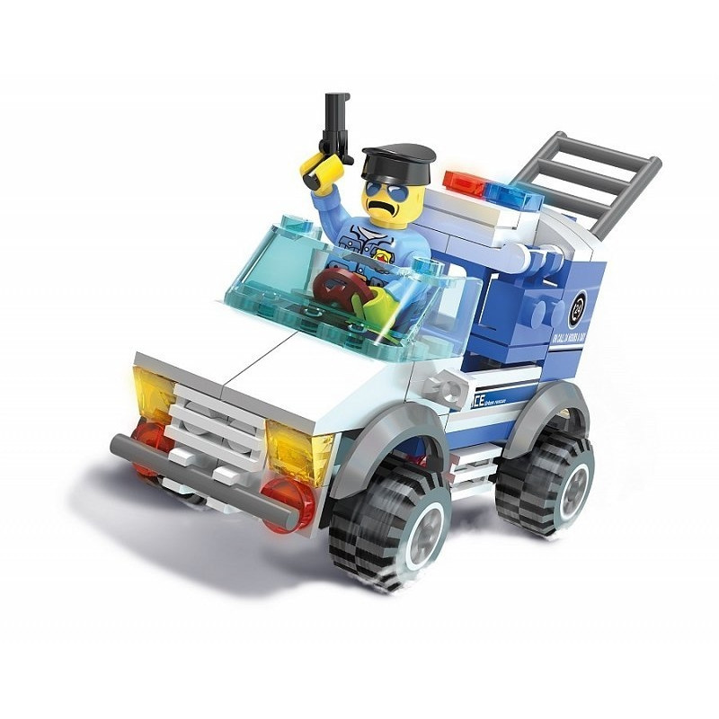 Utilizati elementele incluse in set pentru a construi un jeep politie si o figurina politist cu pistol.