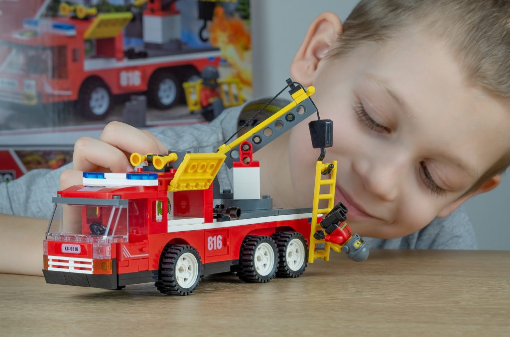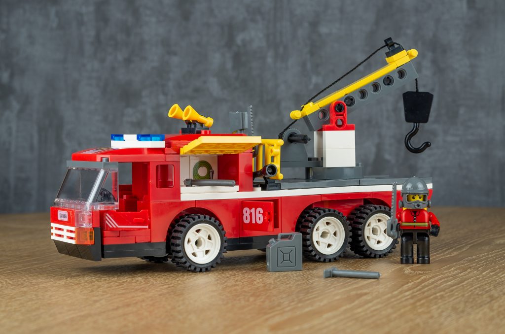 Jocul de constructie este format din piese care se asambleaza pentru a forma o masina de interventie echipata cu troliu pentru remorcare, 2 spatii pentru depozitare echipament, precum si o figurina pompier cu accesorii.