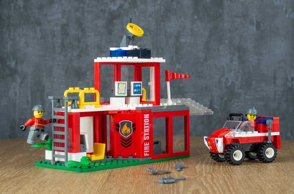 Jocul de constructie Statie de pompieri este format din piese care se asambleaza pentru a forma o statie de pompieri cu etaj si o masina de interventie care permite pompierilor sa se deplaseze, precum si 2 figurine pompieri.