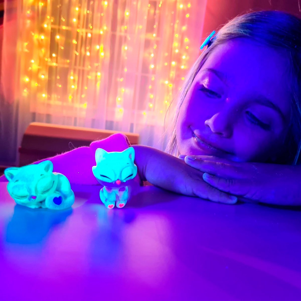 Unele personaje isi schimba culoarea in apa sau stralucesc in intuneric! Pentru ca un pisoi sa straluceasca in intuneric, acesta trebuie mai intai tinut la soare sau sub o lampa timp de cateva minute. Si pentru ca personajele sa isi schimbe culoarea, temperatura apei trebuie sa fie peste 30-32 de grade.
