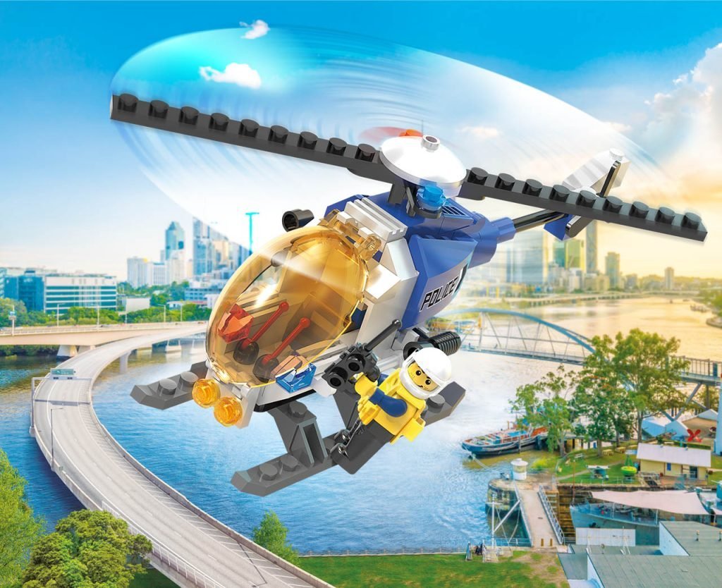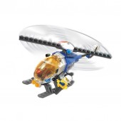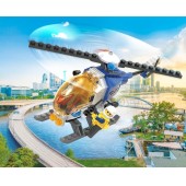 Utilizati elementele incluse in set pentru a construi un elicopter politie si o figurina politist cu statie emisie-receptie.