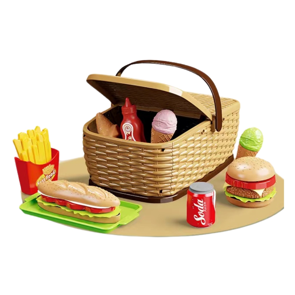 Un cos de picnic adorabil si interactiv, plin cu 20 de elemente de fast food de jucarie, ce imita preparate populare precum hamburgeri, cartofi prajiti, sucuri si multe altele. Fiecare detaliu este atent realizat pentru a adauga realism jocului si pentru a incuraja copiii sa invete despre alimentatie, interactiuni sociale si sa simuleze experiente cotidiene. Cosul este usor de transportat si poate fi folosit atat in interior, cat si in aer liber.