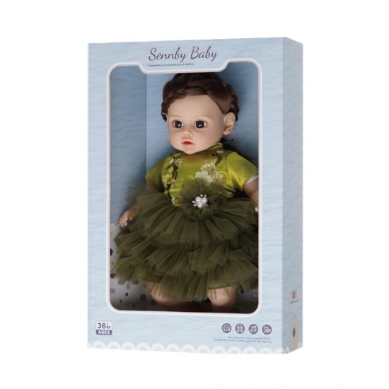 Papusa cu corp moale si 6 sunete 35 cm bruneta cu rochie verde, ZJA329538