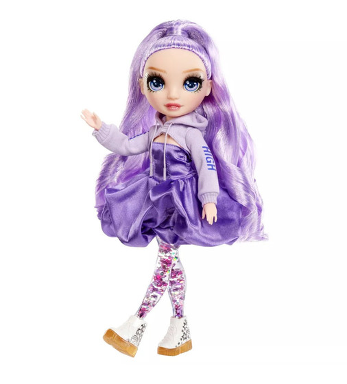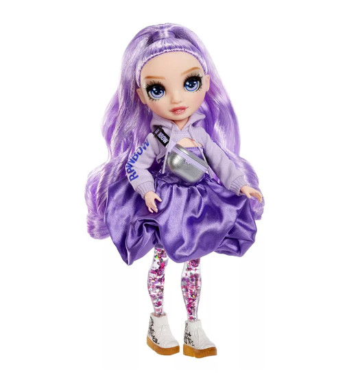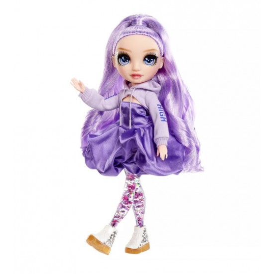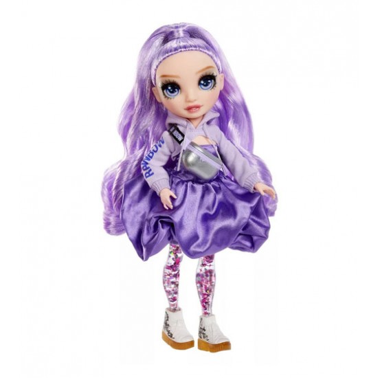 Papusa Rainbow High este o frumusete stilata cu par si haine de o culoare mov delicata. Viola are o trasatura distinctiva - picioarele ei transparente sunt pline de straluciri lichide magice!