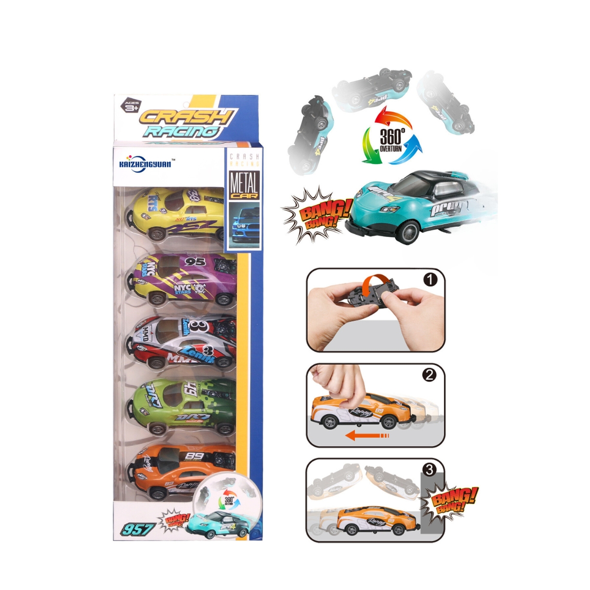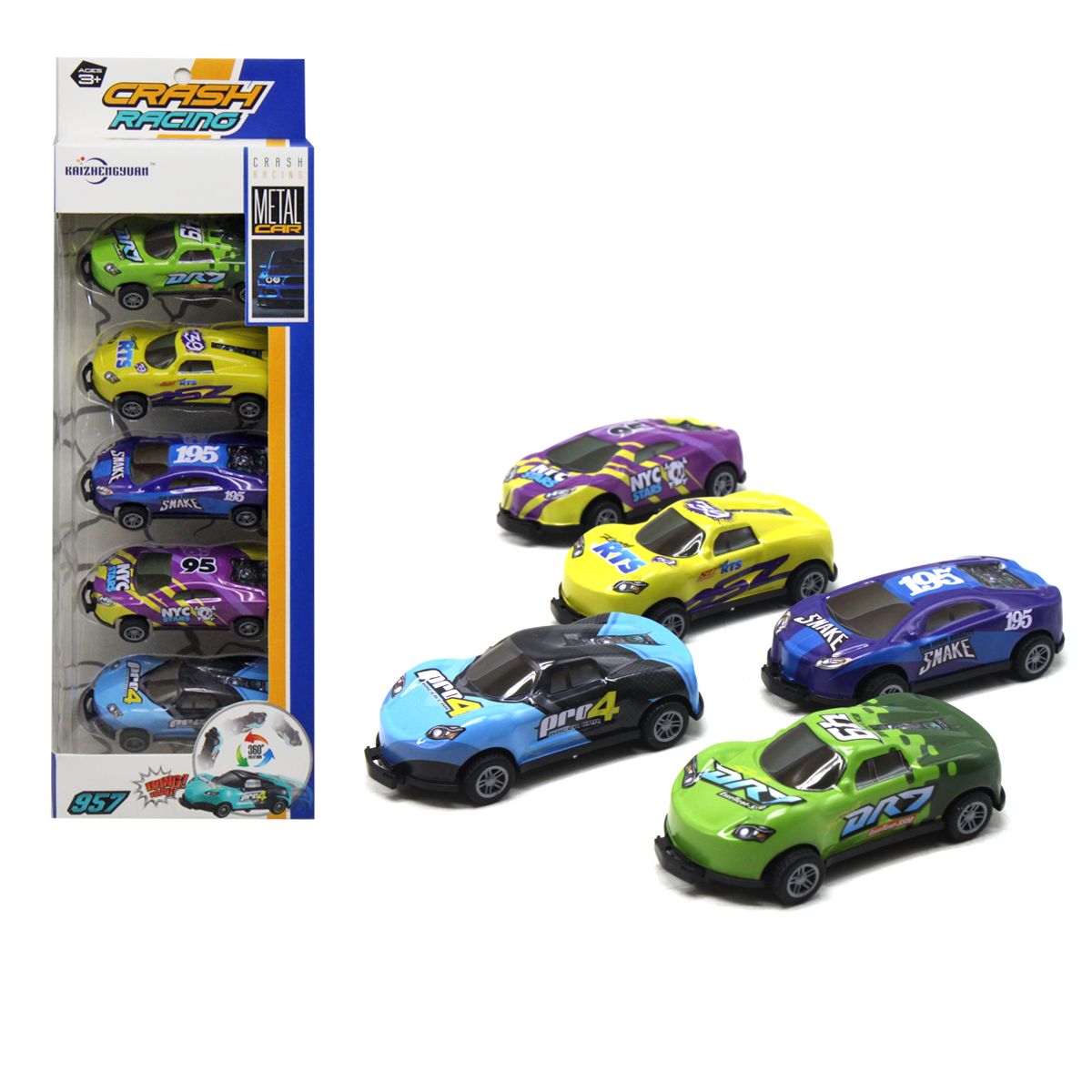 Set cu 5 masini din metal diferite, functie salt in fata