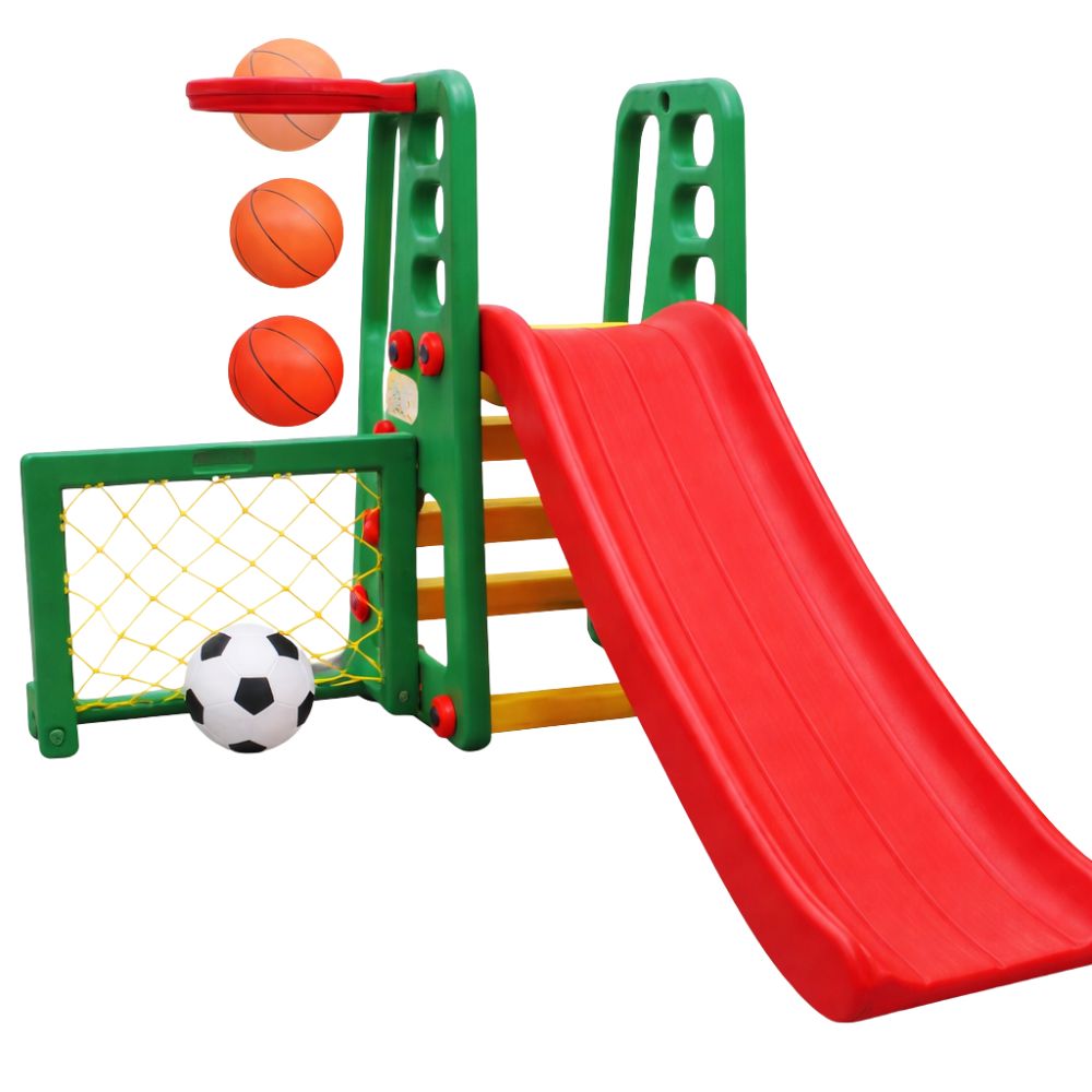 Tobogan multifunctional pentru copii, 4 trepte, cos baschet cu minge si poarta fotbal, reglabil pe inaltime, VERDE, 167x51x103 cm