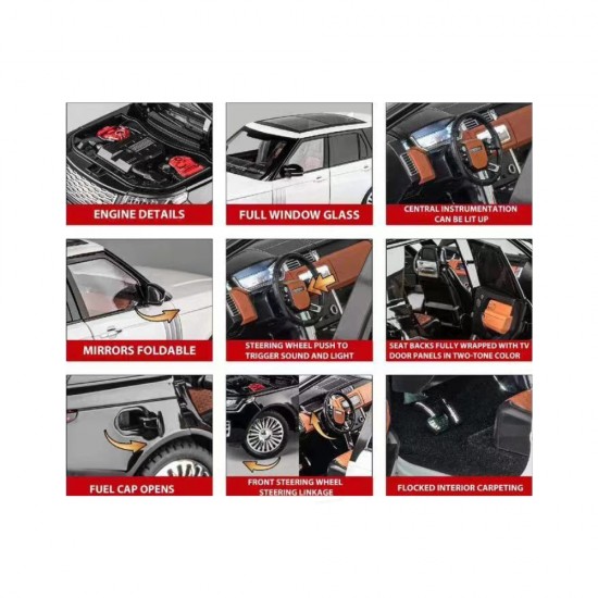 Macheta auto Range Rover este o piesa de colectie impresionanta pentru toti amatorii si colectionarii de autovehicule. Macheta este echipata cu functia pullback, ceea ce iti permite doar sa o tragi putin inapoi iar ea se va deplasa singura, realizata la scara 1:18, toate usile pot fi deschise. Este fabricata din metal durabil si echipata cu sunete si lumini functionale, ceea ce o face o jucarie super interactiva.