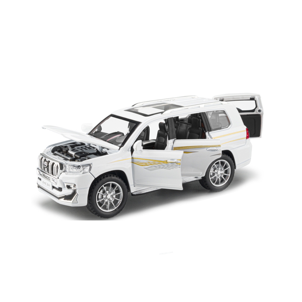 Macheta auto Toyota Land Cruiser Prado este o piesa de colectie impresionanta pentru toti amatorii si colectionarii de autovehicule. Macheta este echipata cu functia pullback, ceea ce iti permite doar sa o tragi putin inapoi iar ea se va deplasa singura, realizata la scara 1:24, toate usile pot fi deschise. Este fabricata din metal durabil si echipata cu sunete si lumini functionale, ceea ce o face o jucarie super interactiva.