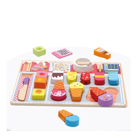 Un puzzle cu piese din lemn colorate si o baza din lemn care va aduce bucurie fiecarui creator de inghetata.