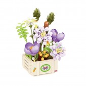 Setul face parte din colectia Flower & Plant Series si contine piese de calitate, care permit realizarea unui aranjament floral realist cu flori mov, galbene si albe, asezate intr-un ghiveci tip ladita decorativa.