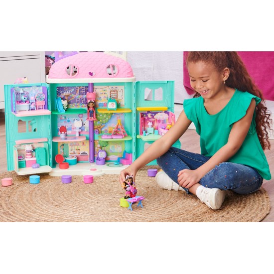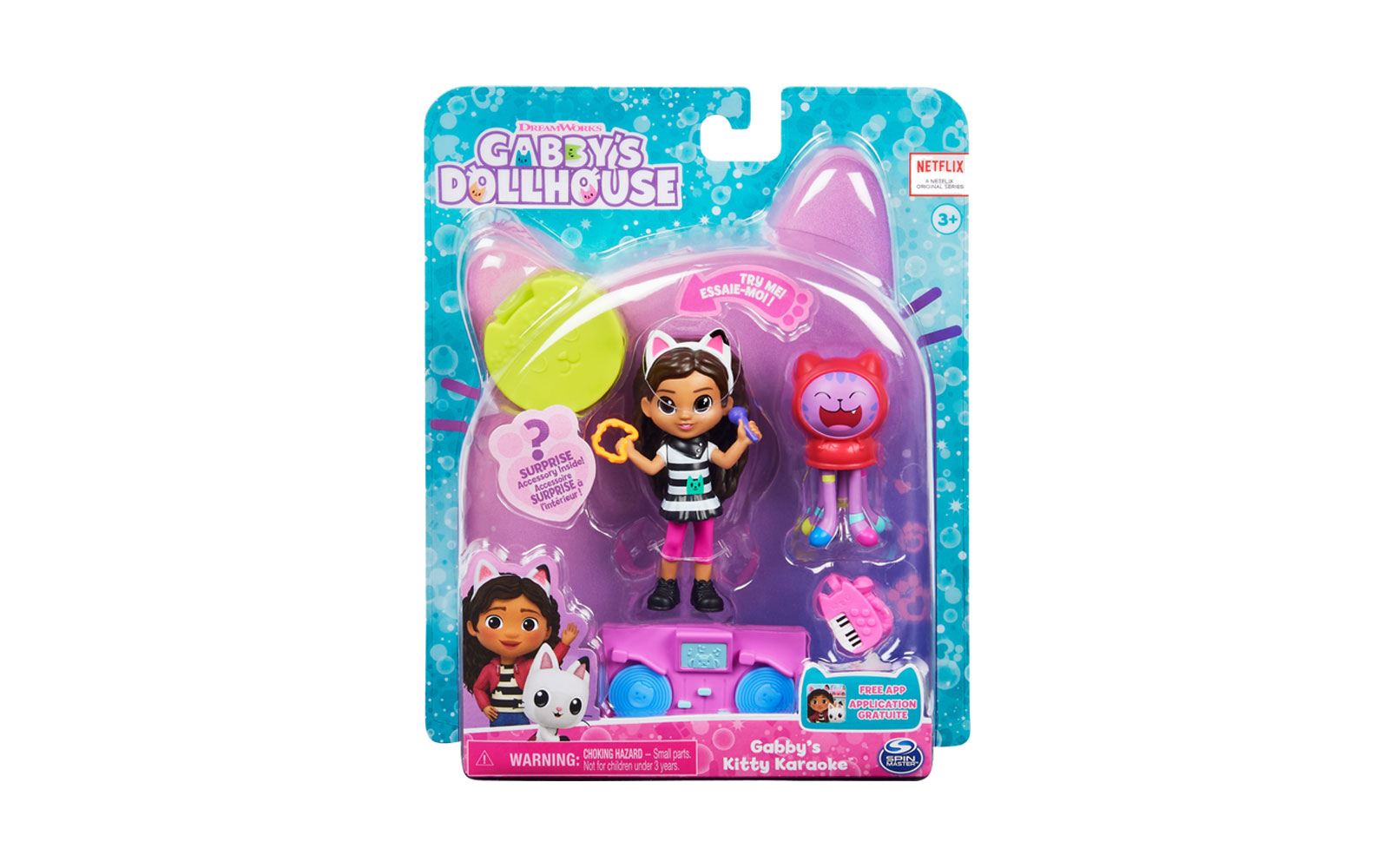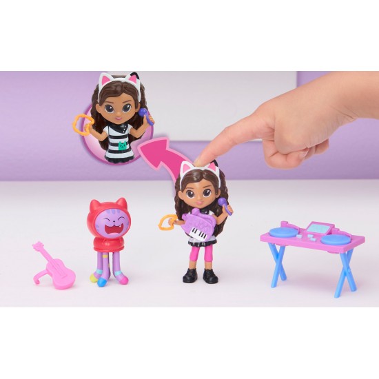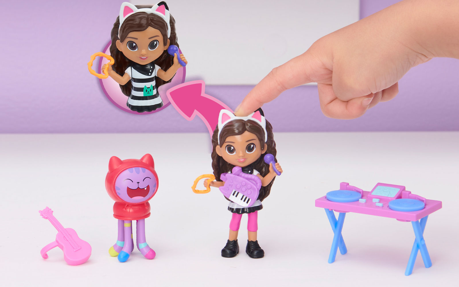 Apasati pe urechile de pisica ale figurinei de colectie Gabby Girl pentru a face bratul ei sa se miste in sus si in jos pentru a canta tamburina. In cealalta mana are un microfon pentru distractia la karaoke.
