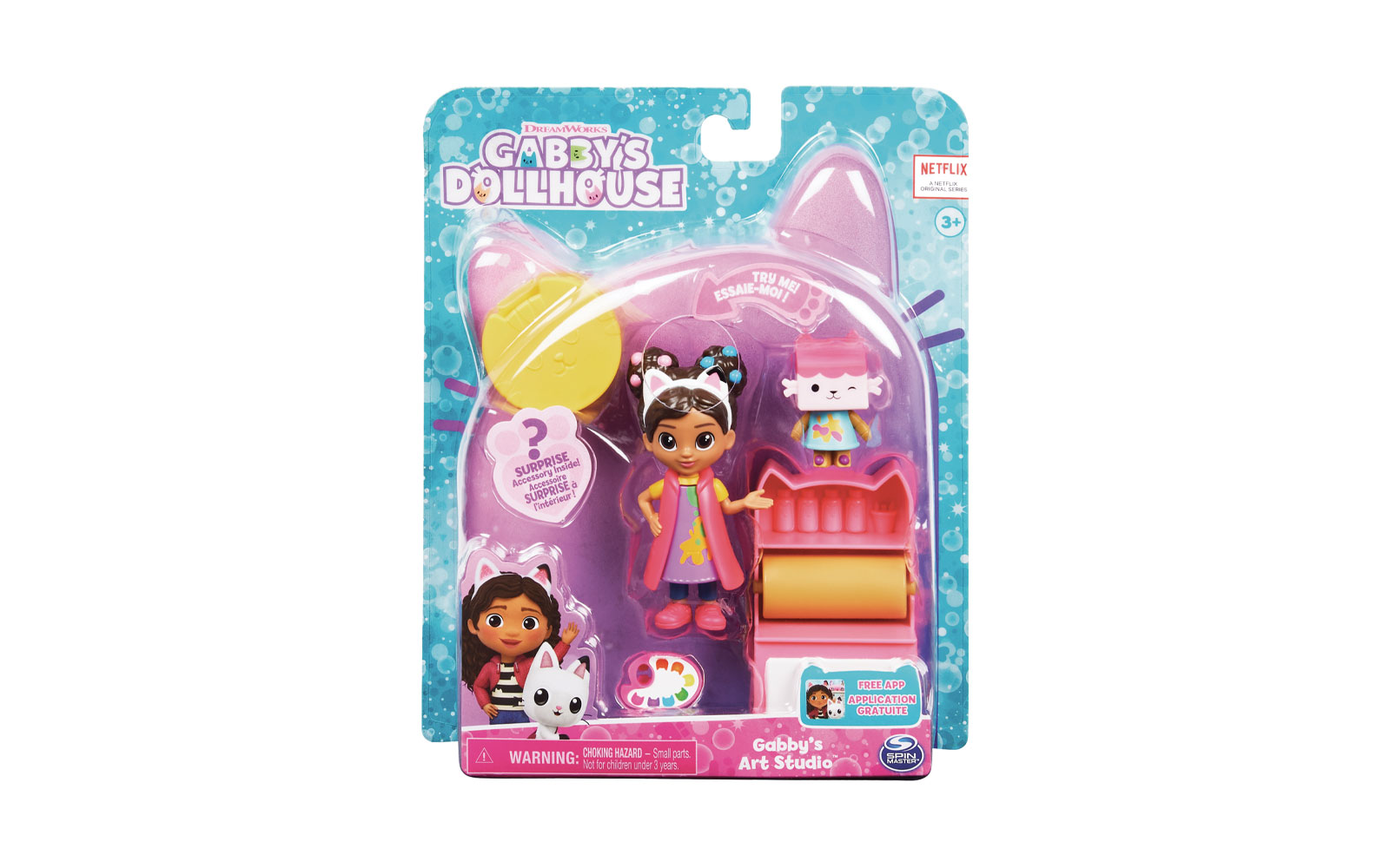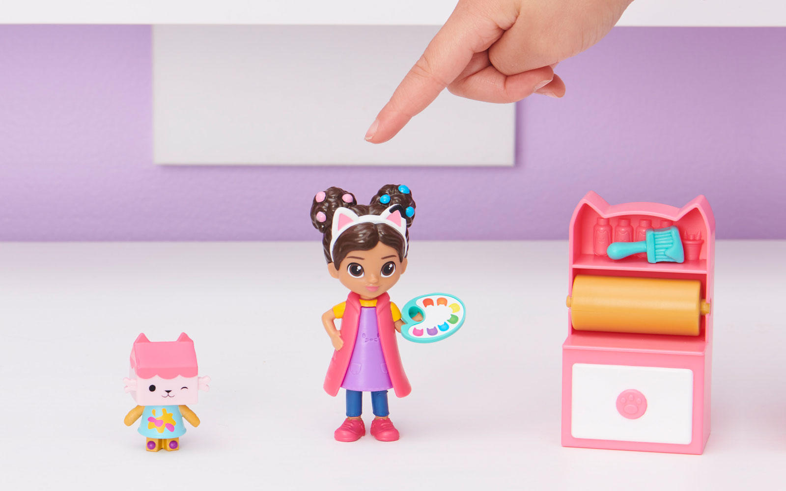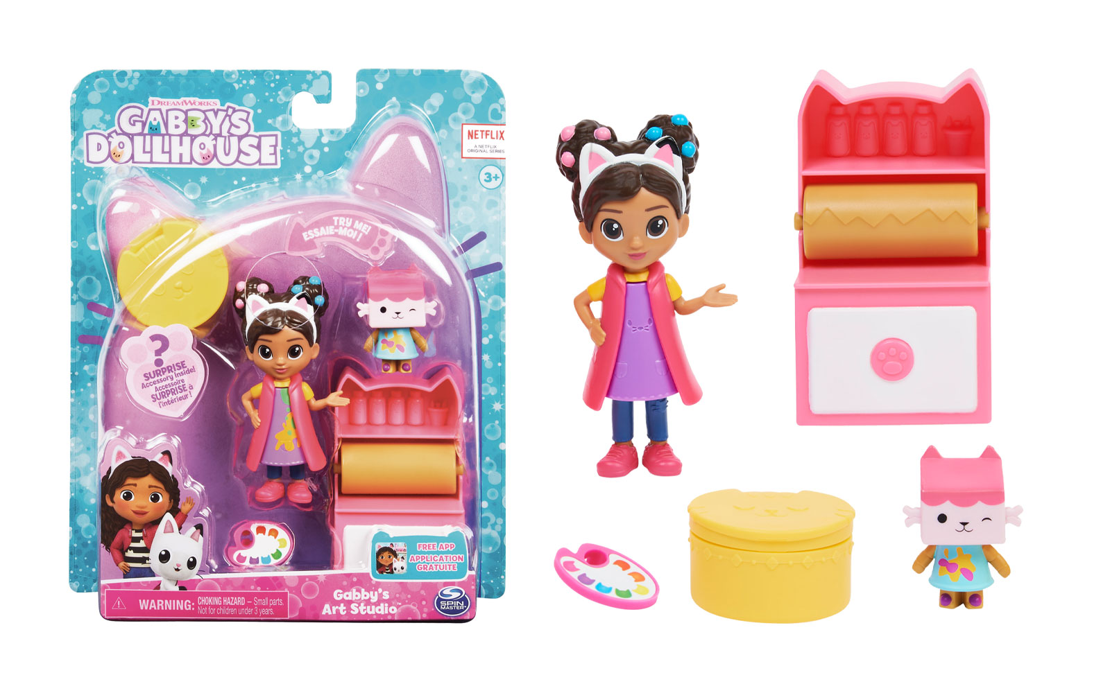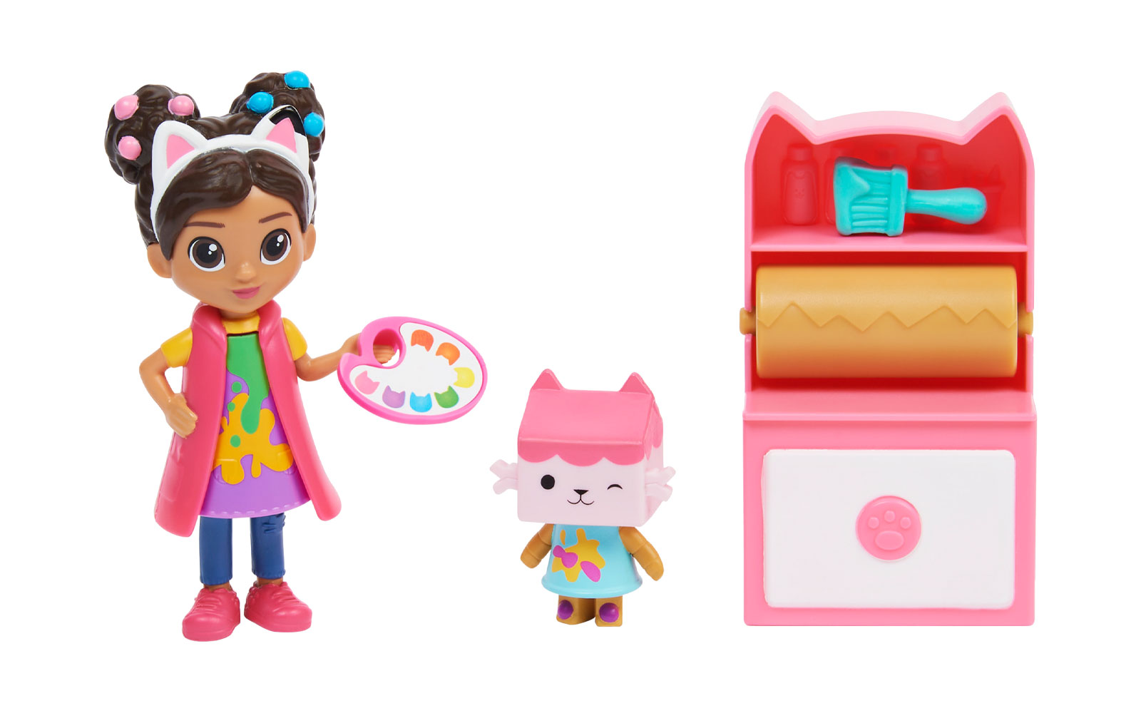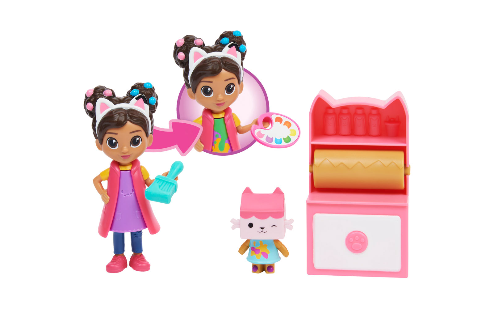 Acest set de figurine distractive include o pisica Baby Box, un accesoriu pentru o paleta de vopsea pe care Gabby o poate tine si un accesoriu mister!