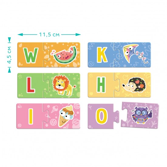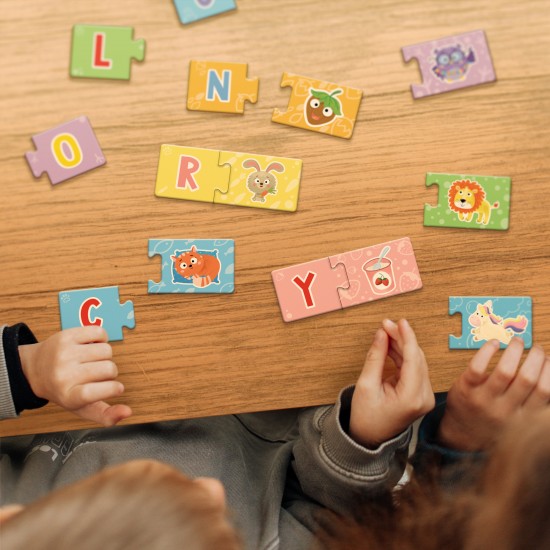 Cu acest Puzzle Duo ve-i putea invata cu usurinta Limba Engleza. Sunt 26 de elemente in total, din care trebuie sa conectezi corect 2 jumatati, dintre care una este o imagine, iar cealalta este o litera a alfabetului englez. Acest set ar fi un cadou grozav pentru un mic iubitor de puzzle-uri. Jocurile cu jumatati de puzzle antreneaza perseverenta, gandirea logica si extind vocabularul.