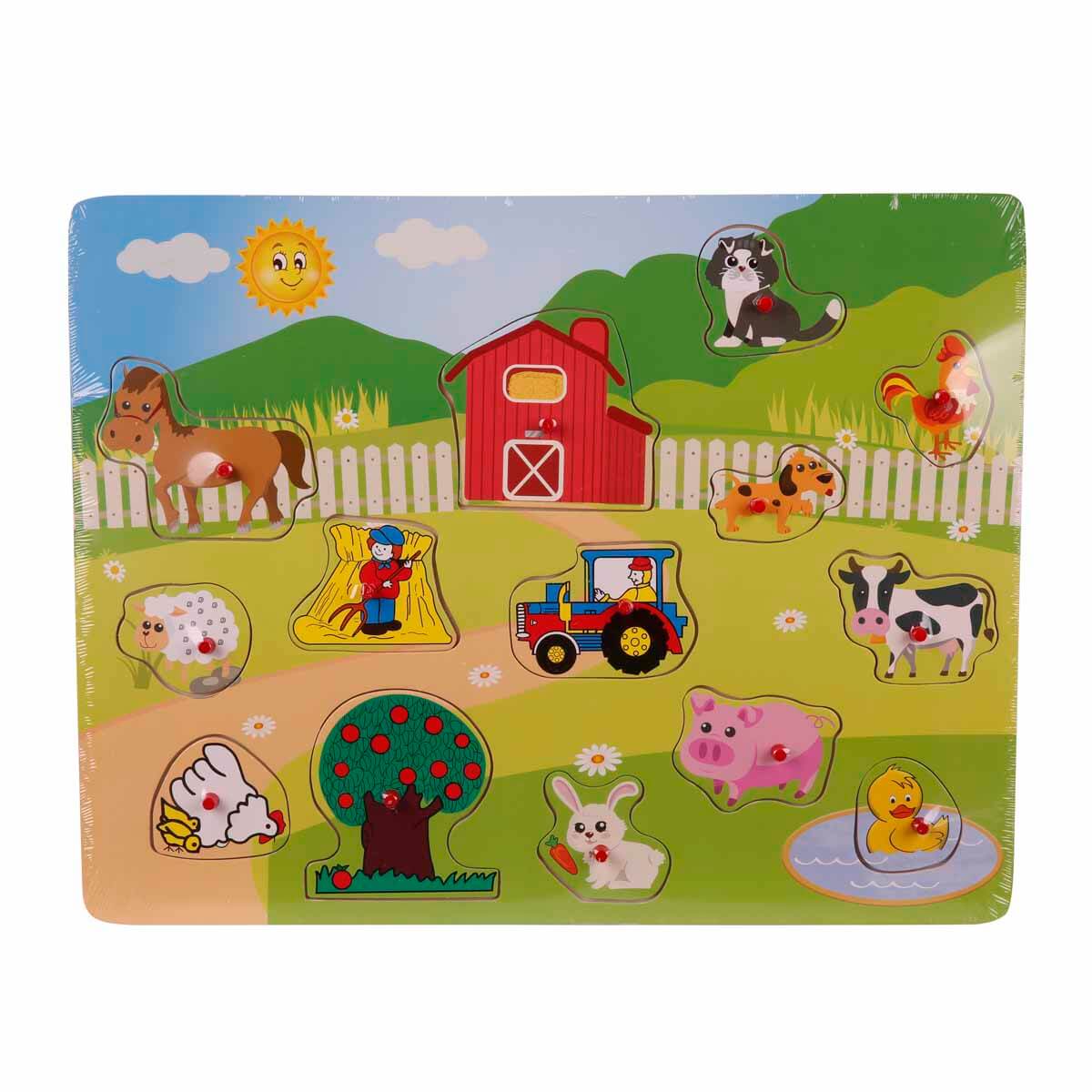 Puzzle din lemn cu buton Animale Domestice, 13 el, Woody
