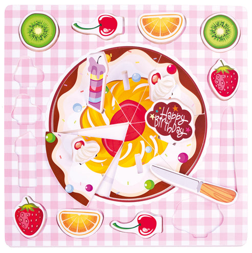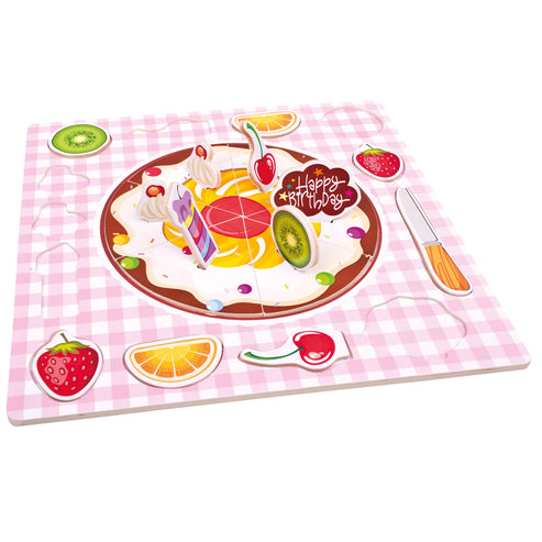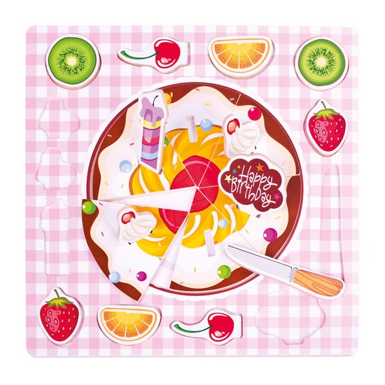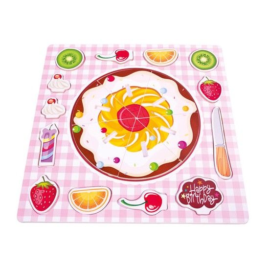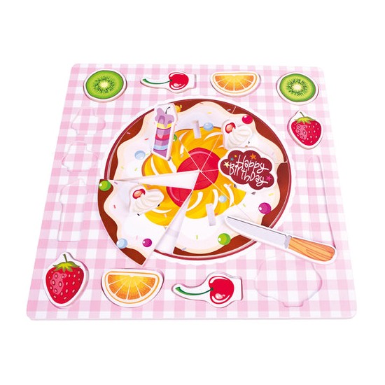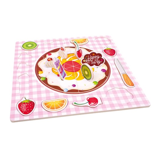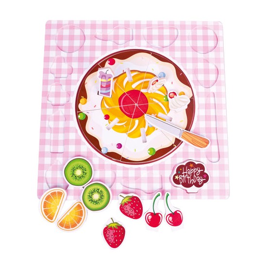 Puzzle din lemn, tort de ziua de nastere. Ingredientele pentru tort pot fi asezate pur si simplu la suprafata sau in gauri speciale. Setul contine un cutit din lemn si semnul "La multi ani". Bun pentru antrenarea abilitatilor de concentrare, consideratie si observare, precum si pentru gandirea logica si luarea deciziilor in gasirea pieselor potrivite.