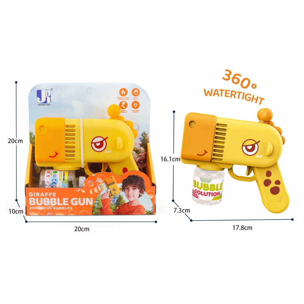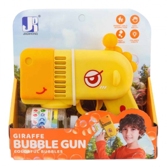Designul sau jucaus, inspirat de o girafa simpatica in culori vibrante, capteaza imediat atentia copiilor si le stimuleaza creativitatea. Fiind foarte usor de manevrat, pistolul permite micutilor sa exploreze si sa interactioneze cu mediul inconjurator intr-un mod activ si plin de zambete. Este accesoriul perfect pentru iesirile in parc, joaca in curte sau pentru a anima atmosfera la petrecerile aniversare.