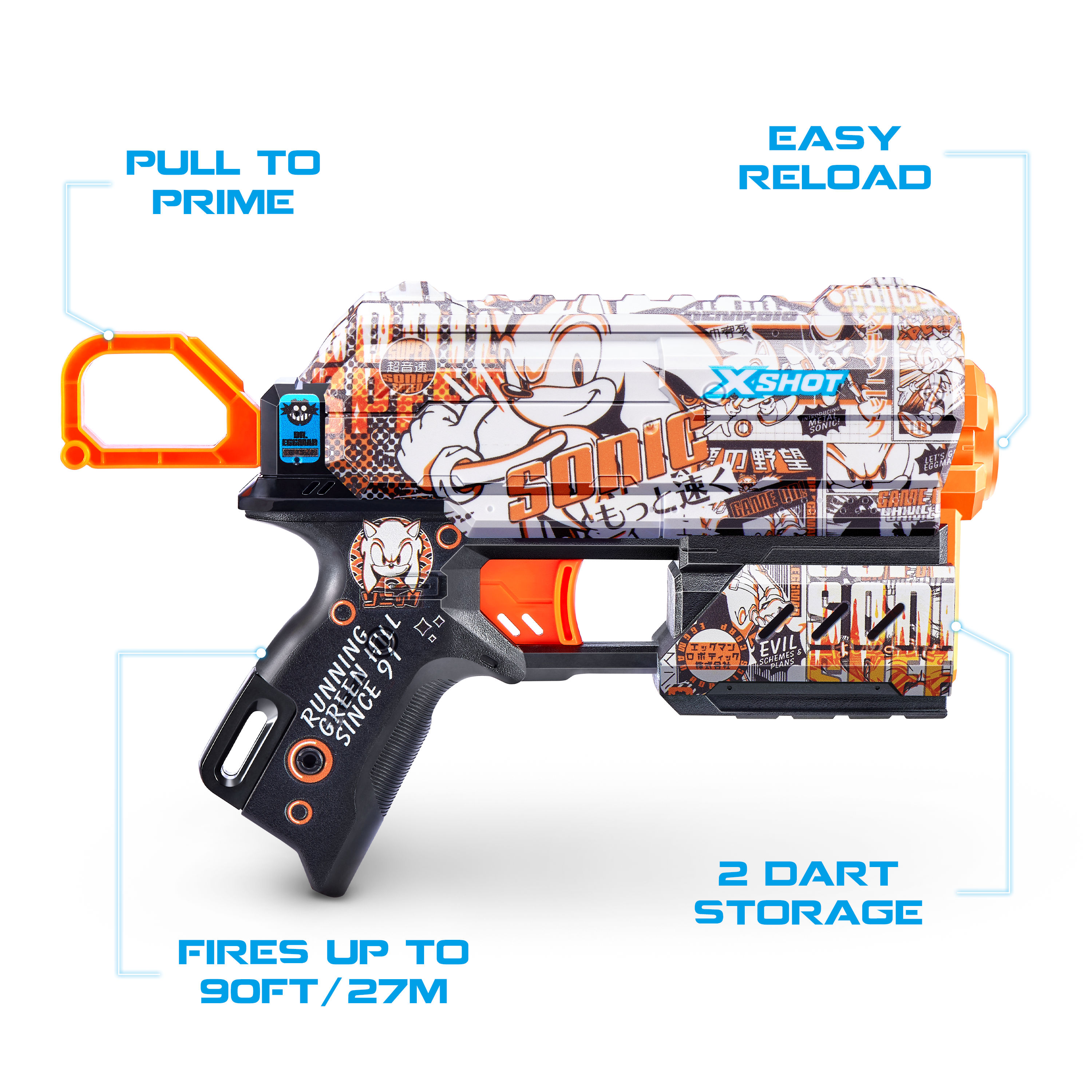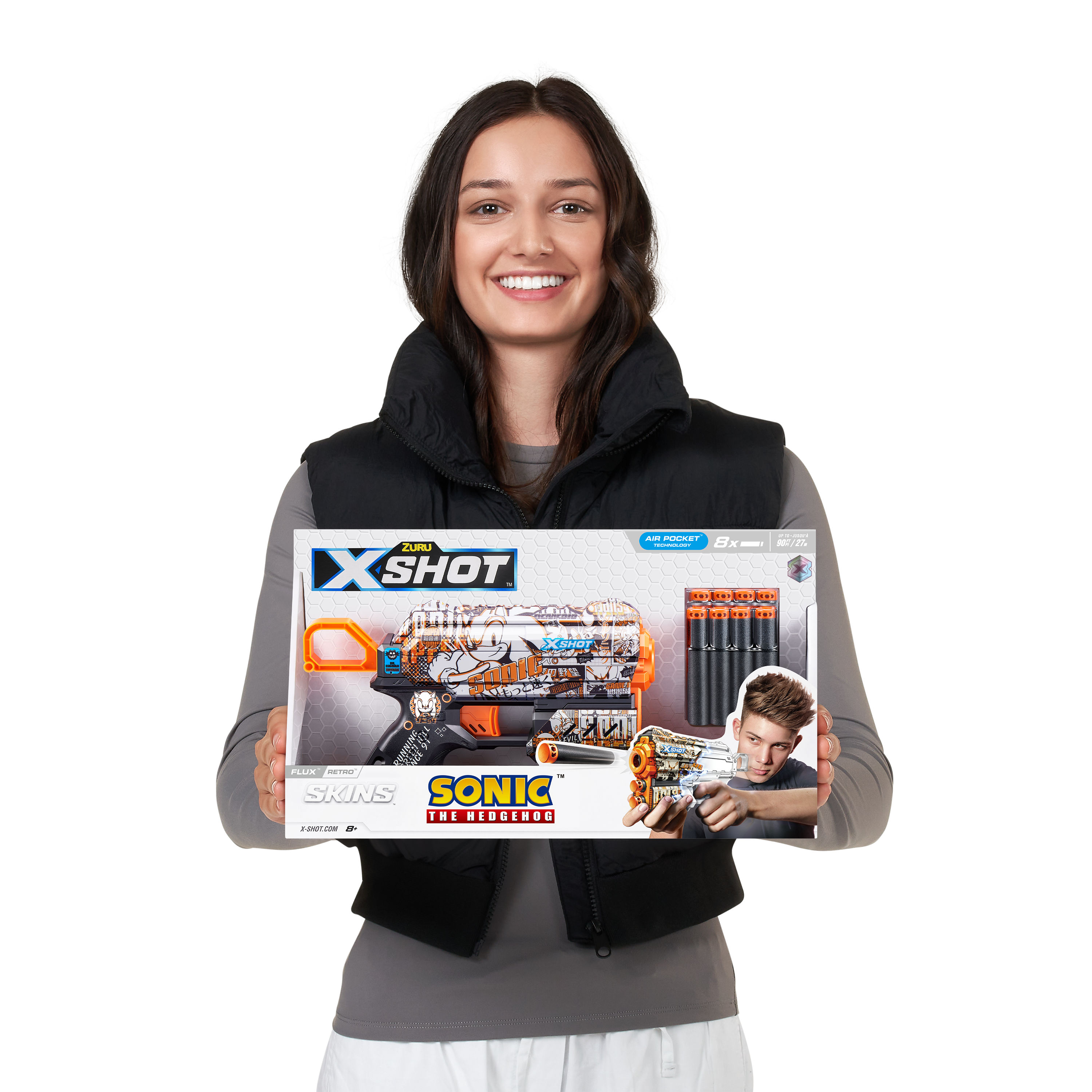 Alege Blasterul X-Shot Skins Flux,Sonic Retro si alatura-te luptei! Acest blaster nu trebuie sa lipseasca din colectia ta. Are stocare inferioara pentru sageti, astfel incat sa il puteti reincarca rapid si sa va intoarceti in lupta. X-Shot Skins dispun de noua tehnologie Air Pocket pentru impuscaturi mai rapide, mai lungi si mai precise.