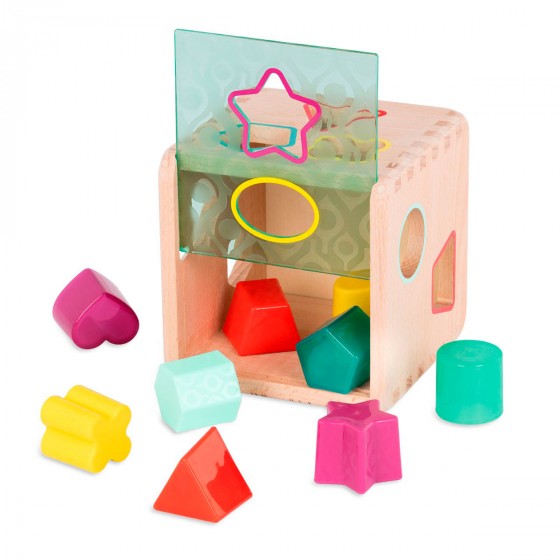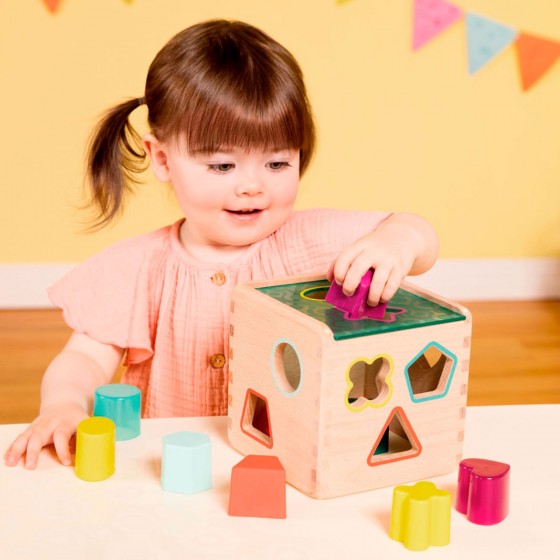 Copilul va invata culorile, formele si dexteritatea. Copilul trebuie sa aleaga figura potrivita pentru fiecare gaura de pe cub. Sortator din lemn cu 9 figuri unice din plastic colorat. Jucaria promoveaza recunoasterea formei si a culorilor, fiind decorate cu ornamente frumoase.