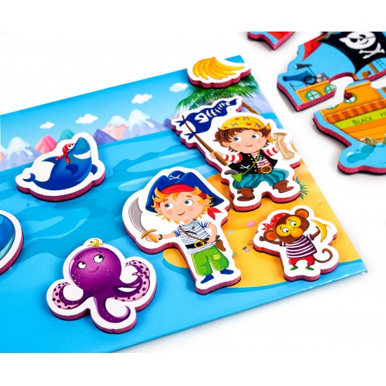 Continutul pachetului: 28 de magneti tematici, tabla magnetica. Confectionat din materiale polimerice.