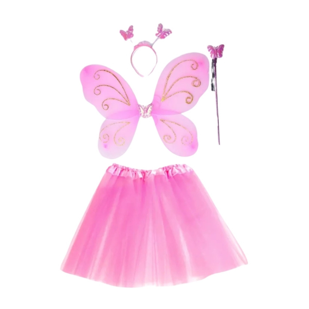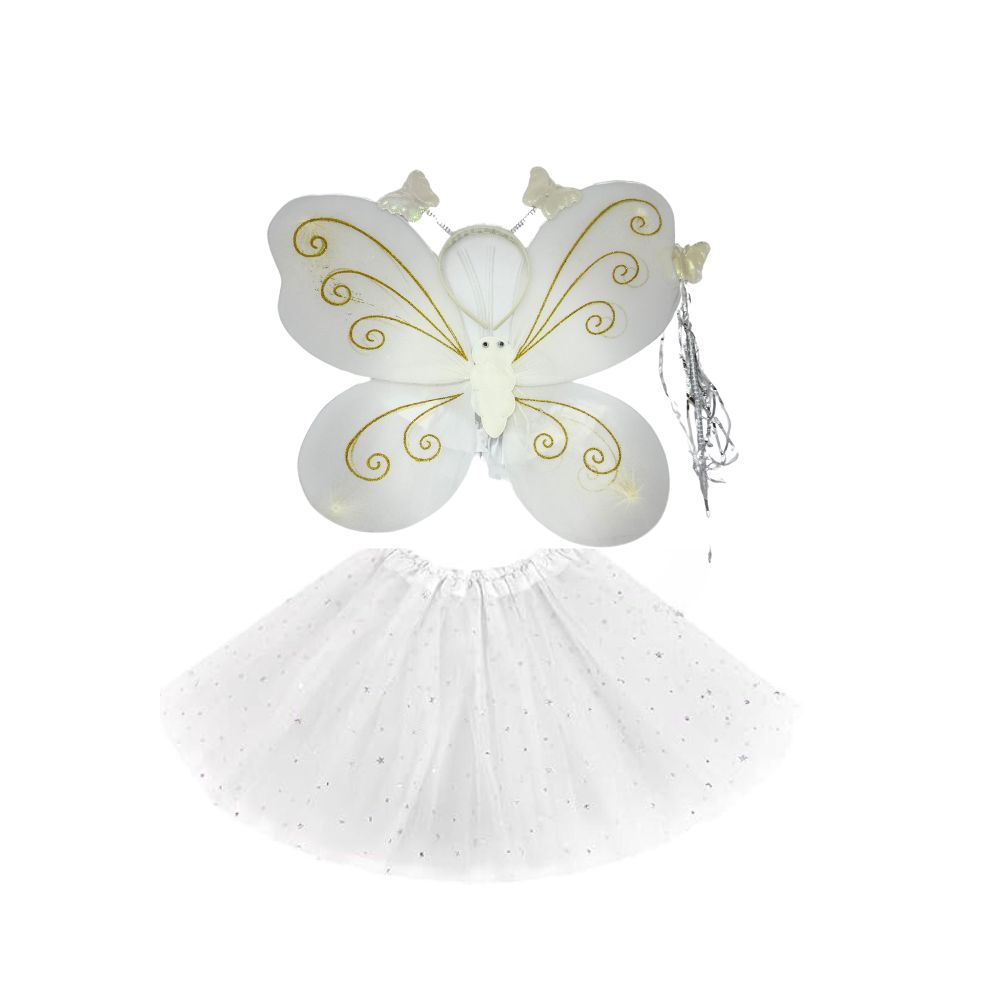 Un set adorabil si plin de culoare pentru copii, perfect pentru carnaval sau petreceri tematice. Aripile de fluture si fustita vaporoasa sunt create in trei nuante dintr-un material usor si transparent. Aripile au bretele elastice pentru a se fixa confortabil pe spatele copilului. In set ve-i gasi un cerc si o bagheta care va adauga un plus de farmec tinutei.