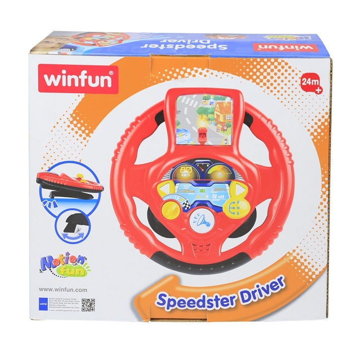 Contine sunete specifice masinii, joc captivant cu masinuta care merge in momentul in care volanul este miscat, claxon functional.