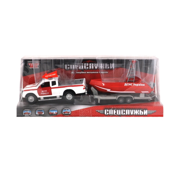 Sunt atat de aproape de prototipurile reale. Setul include: un model auto a unui vehicul de salvare, o remorca si o barca de patrulare moderna. Miscarea masinii este insotita de semnale luminoase si sonore. Jucaria dezvolta imaginatia si abilitatile creative. Varsta recomandata - de la 3 ani. Efectele de iluminare si sunet sunt alimentate cu 3 baterii AG3 (incluse).Confectionat din metal si mase plastice.