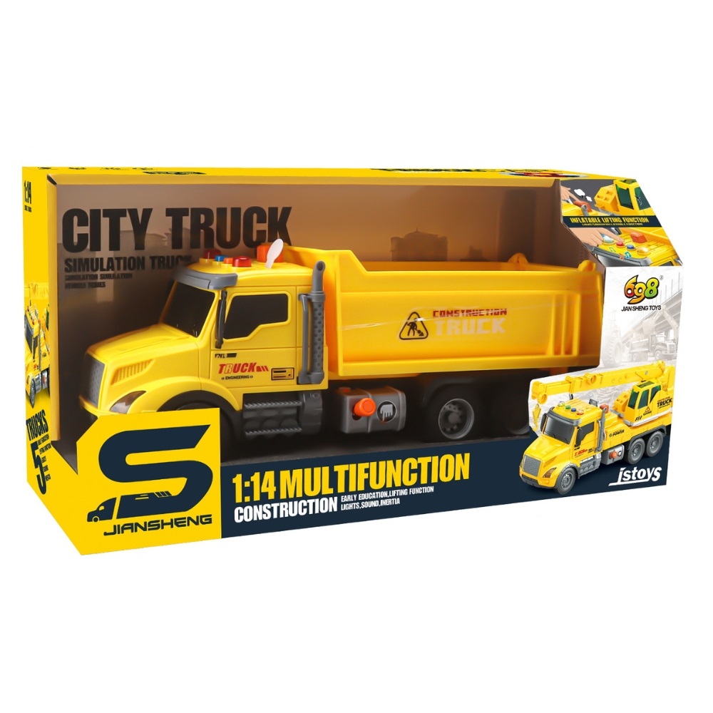 Camion basculanta galbena cu frictiune, buton presiune, sunete si lumini, 1:14, jstoys, ZJA363775